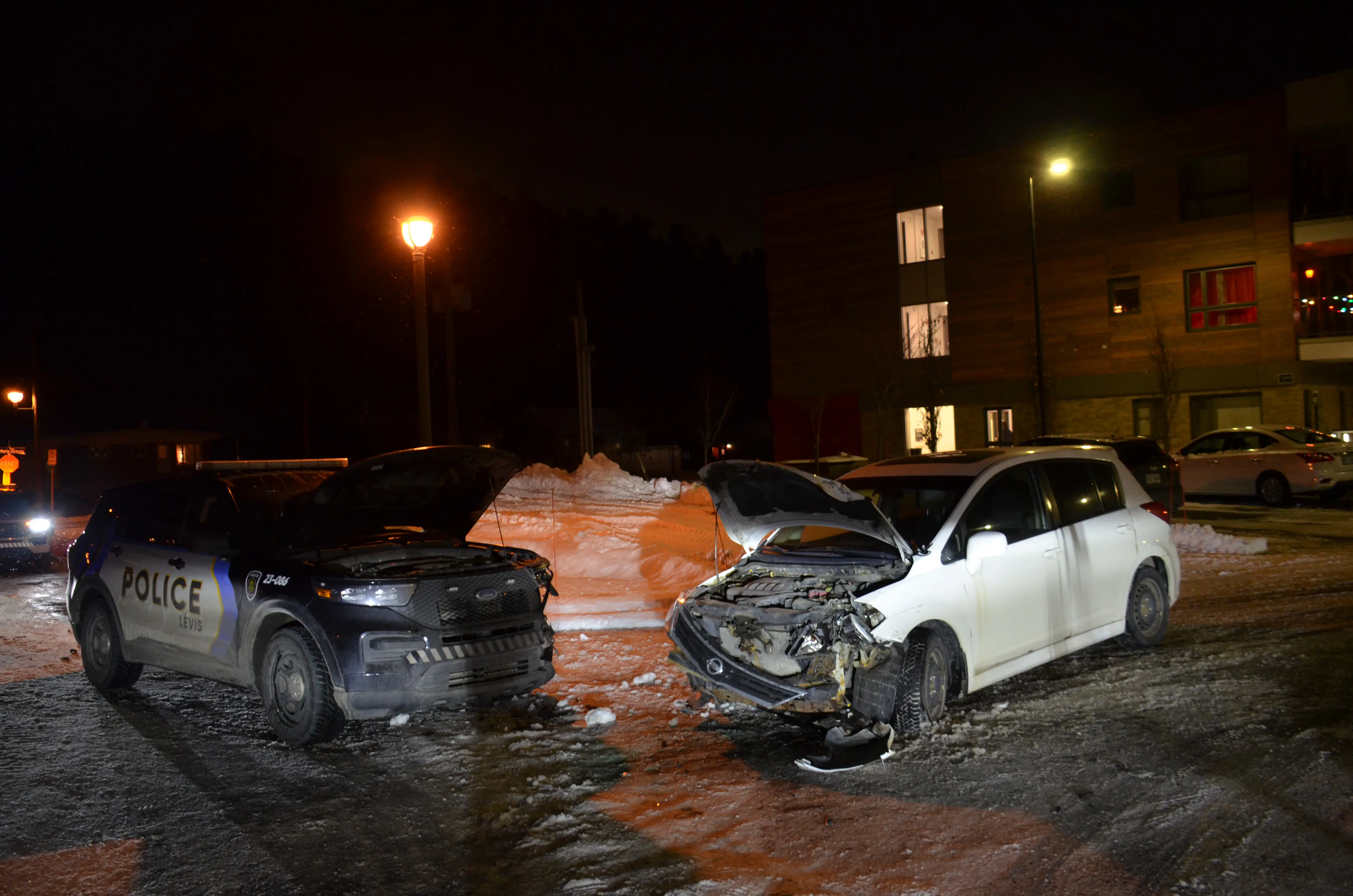 Alors qu'elles répondaient à un appel, les deux policières à bord du véhicule ont perdu le contrôle avec la route glacée et sont entrés en contact avec l'autre véhicule qui ne contenait aucun passager. Les deux policières ont été transportées de manière préventive en centre hospitalier pour des blessures légères.
