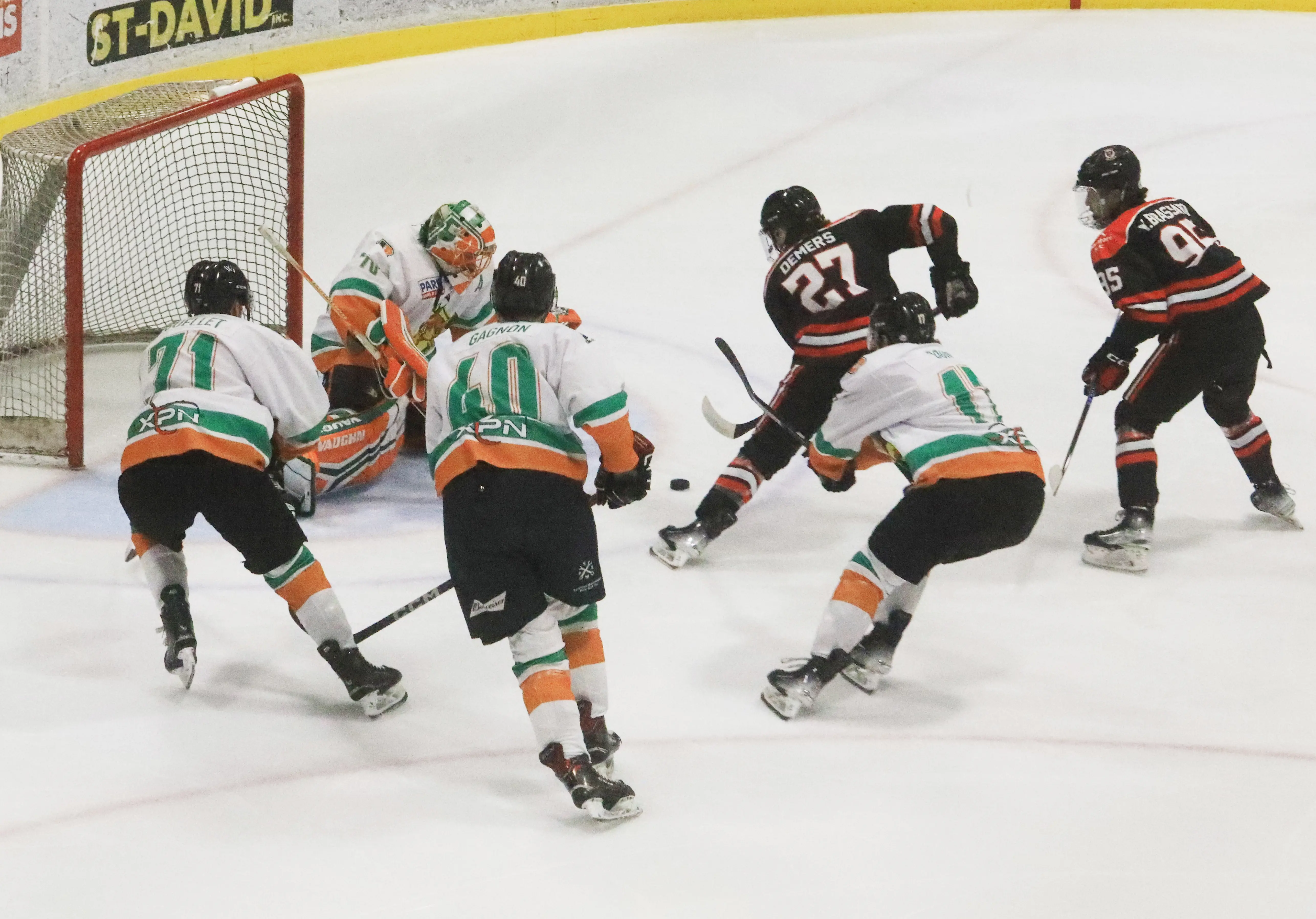 .JPG) C'est un duel très serré que les deux formations ont joué à Saint-Romuald. -Photo : Gilles Boutin