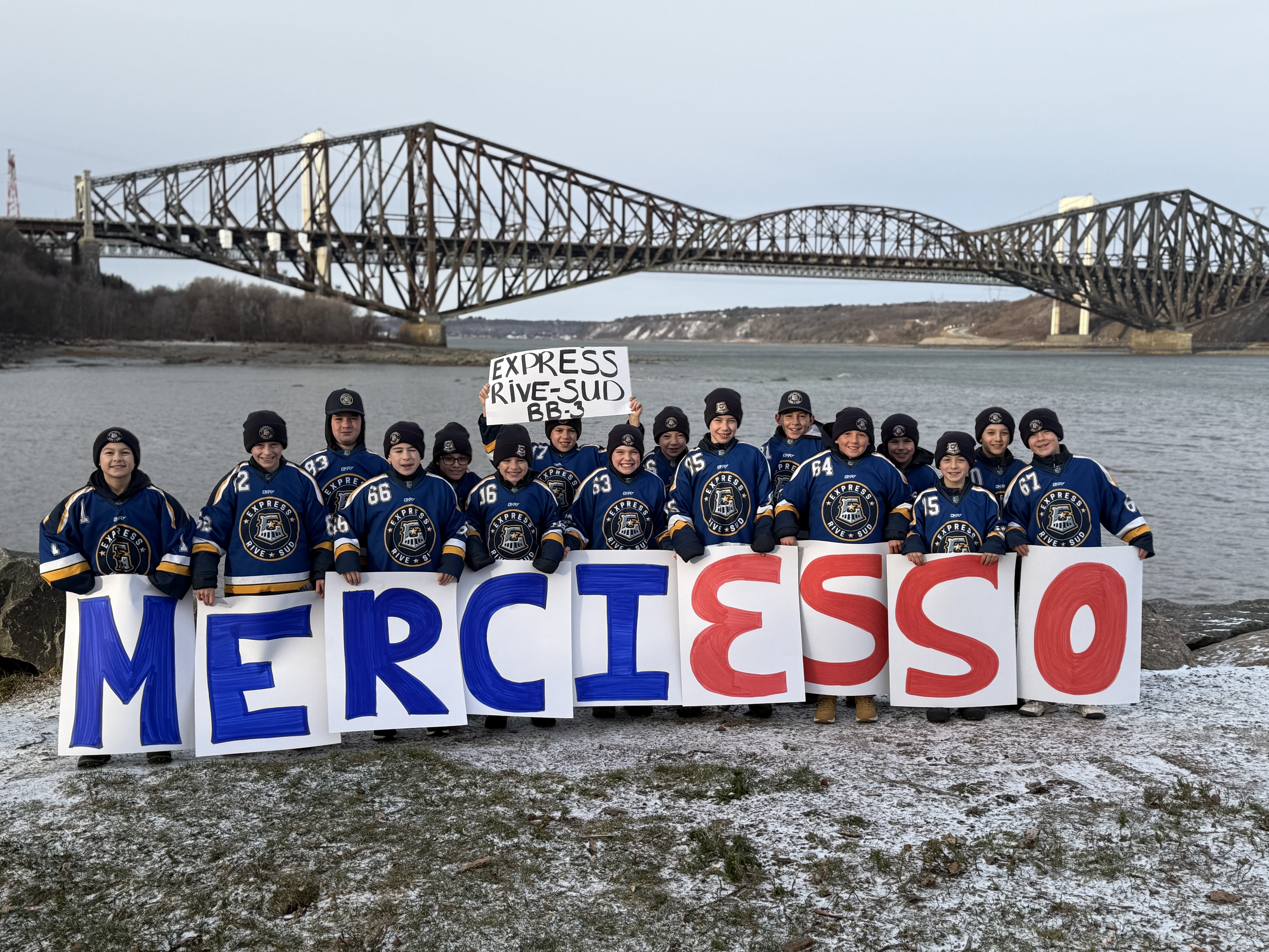 «Tout a commencé par un concours auquel les équipes pouvaient s’inscrire pour courir la chance de jouer sur la glace de leurs idoles, les Canadiens de Montréal. En tant que gérante, j’ai embarqué les jeunes dans cette belle folie et nous avons soumis notre candidature. Pour être admissibles, nous devions envoyer une photo représentant bien notre ville. Comme l’événement était en lien avec ESSO, nous sommes allés à la Marina de Saint-Romuald avec les jeunes en chandail d’équipe et des pancartes “Merci ESSO”», explique Mary-Eve Jalbert, gérante de l’équipe.