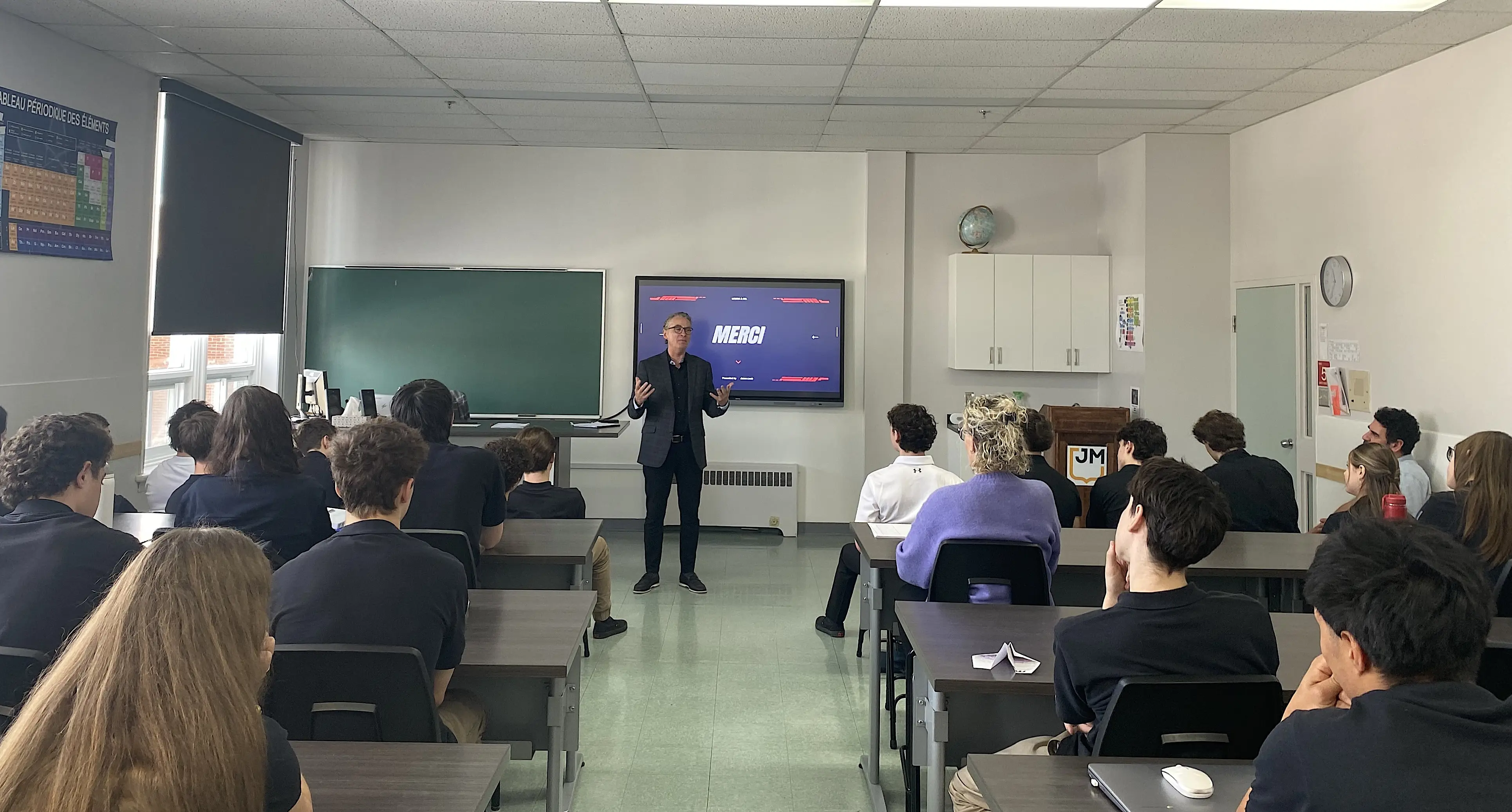 Les élèves du CJMB ont eu droit à la visite de Martin Boucher, propriétaire et président-directeur général du Groupe Boucher possédant 29 franchises sous les bannières Sports Experts, Atomsphère, Entrepôt du hockey et Mathieu Performance. Ce dernier a proposé une étude de cas entrepreneuriale aux élèves, qui avaient 48h pour l’analyser, la résoudre et soumettre une solution. Les équipes gagnantes pourront visiter le siège social du Groupe Boucher pour découvrir les dessous de l’organisation et de la gestion d’un commerce de détail.