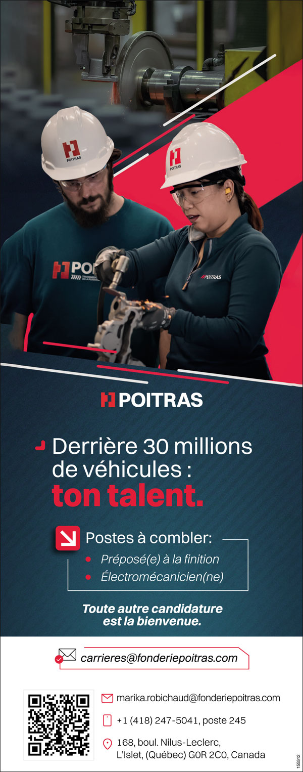 Poitras Préposé(e) à la finition / Électromécanicien(ne) Préposé(e) à la finition / Électromécanicien(ne) POSTULEZ MAINTENANT À: carrieres@fonderiepoitras.com