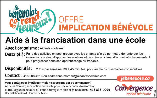 Convergence action bénévole Aide à la francisation dans une école Aide à la francisation dans une école POSTULEZ MAINTENANT À: andreanne.moreau@aidantsscolaires.com