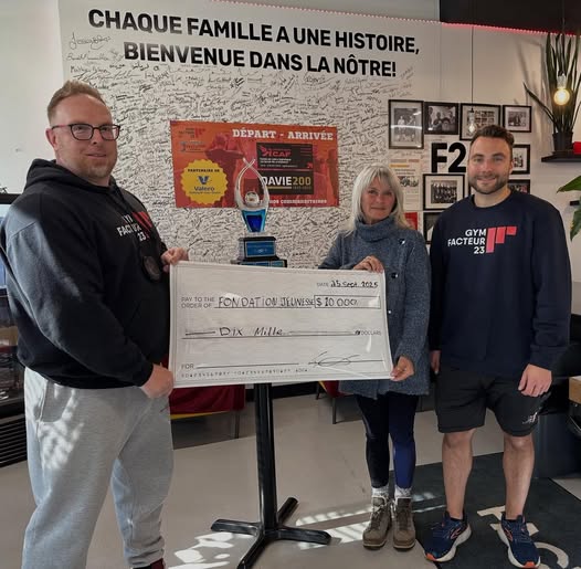 Le Gym Facteur 23 est fier d’avoir remis un chèque de 10 000 $ à la Fondation Jeunesse du Centre intégré de santé et services sociaux (CISSS) de la Chaudière-Appalaches, afin de venir en aide aux enfants en difficulté. Ce montant a été amassé grâce à la tenue du Défi facteur jeunesse qui a eu lieu le 19 septembre dernier. Merci au Gym Facteur 23 et à toutes les personnes qui ont participé et contribué, de près ou de loin, à cet événement.