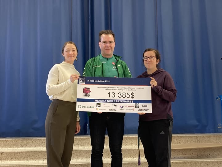 L'école Charles-Rodrigue et des Pixels a accueilli Michel Gariépy, participant du Grand Défi Pierre Lavoie, qui a remis un chèque de 13 385 $ pour soutenir l’activité physique des élèves des écoles lévisiennes. Merci à l’équipe de Desjardins pour leur contribution!