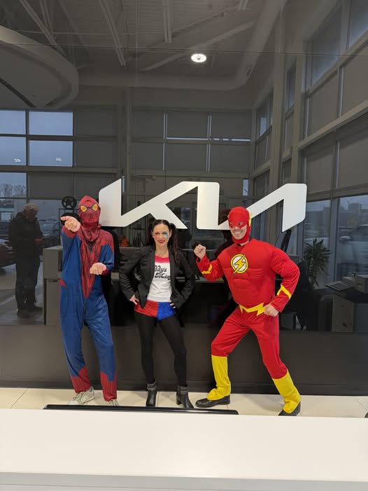 Harley Quinn, Flash et Spider-Man ont accueilli les clients de Kia Lévis, gardant le sourire malgré la pluie.