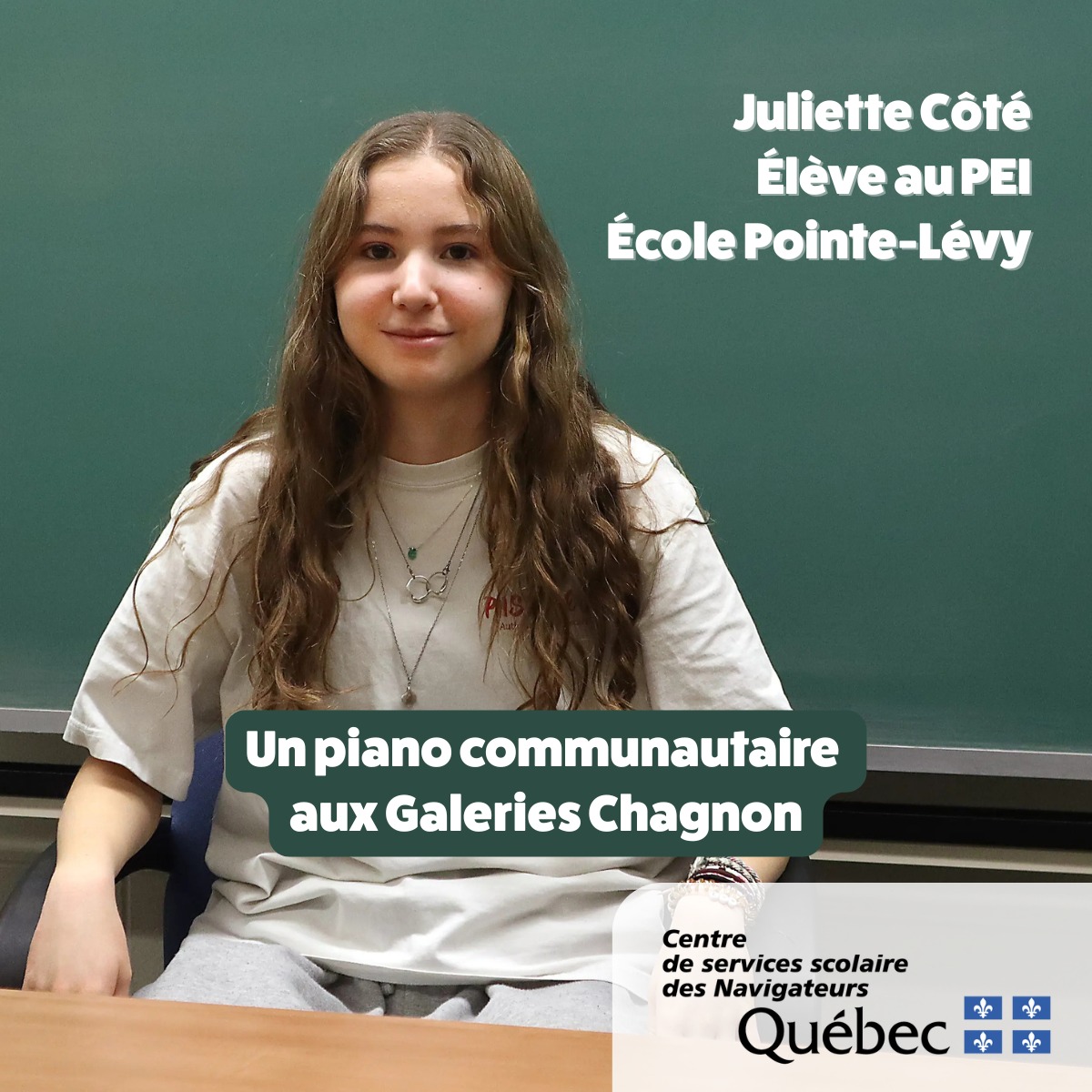 Dans le cadre de son projet personnel de cinquième secondaire, Juliette Côté, élève au PEI de l’École Pointe Lévy, a installé un piano communautaire aux Galeries Chagnon et a organisé un événement d’ouverture. Pianiste depuis l’âge de 8 ans, elle souhaitait allier travail scolaire et passion pour la musique, tout en offrant un projet d’envergure à la communauté.