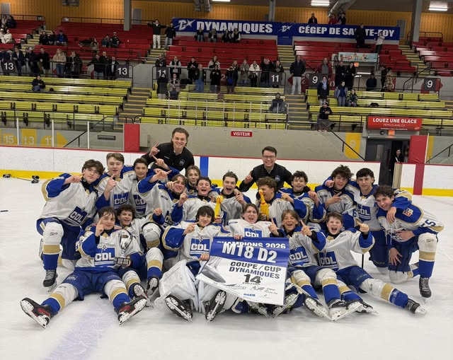 L'équipe du Collège de Lévis sont à leur tour champions de la Coupe Dynamique M18 D2 en l'emportant contre les Spartans du Collège Stanstead par la marque de 4 à 1! Ils complètent ainsi le doublé de nos Commandeurs à la Coupe Dynamique 2026! Félicitations à toute l'équipe et au groupe d'entraîneurs.