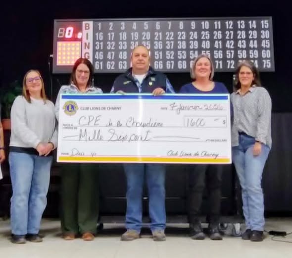 Le 7 janvier, lors du bingo mensuel du Club Lions de Charny, ils ont remis le deuxième versement de 1 600 $ à Suzie Lemay, directrice du CPE de la Chaudière, accompagnée de trois de ses collègues. Le Club Lions de Charny s'est engagé à contribuer pour un total de 8 000 $ afin de soutenir l'aménagement et la bonification du matériel des cours extérieures de leurs cinq installations. Bravo à tous les membres du club qui appuient ce projet qui profitera directement aux enfants de la communauté lévisienne.