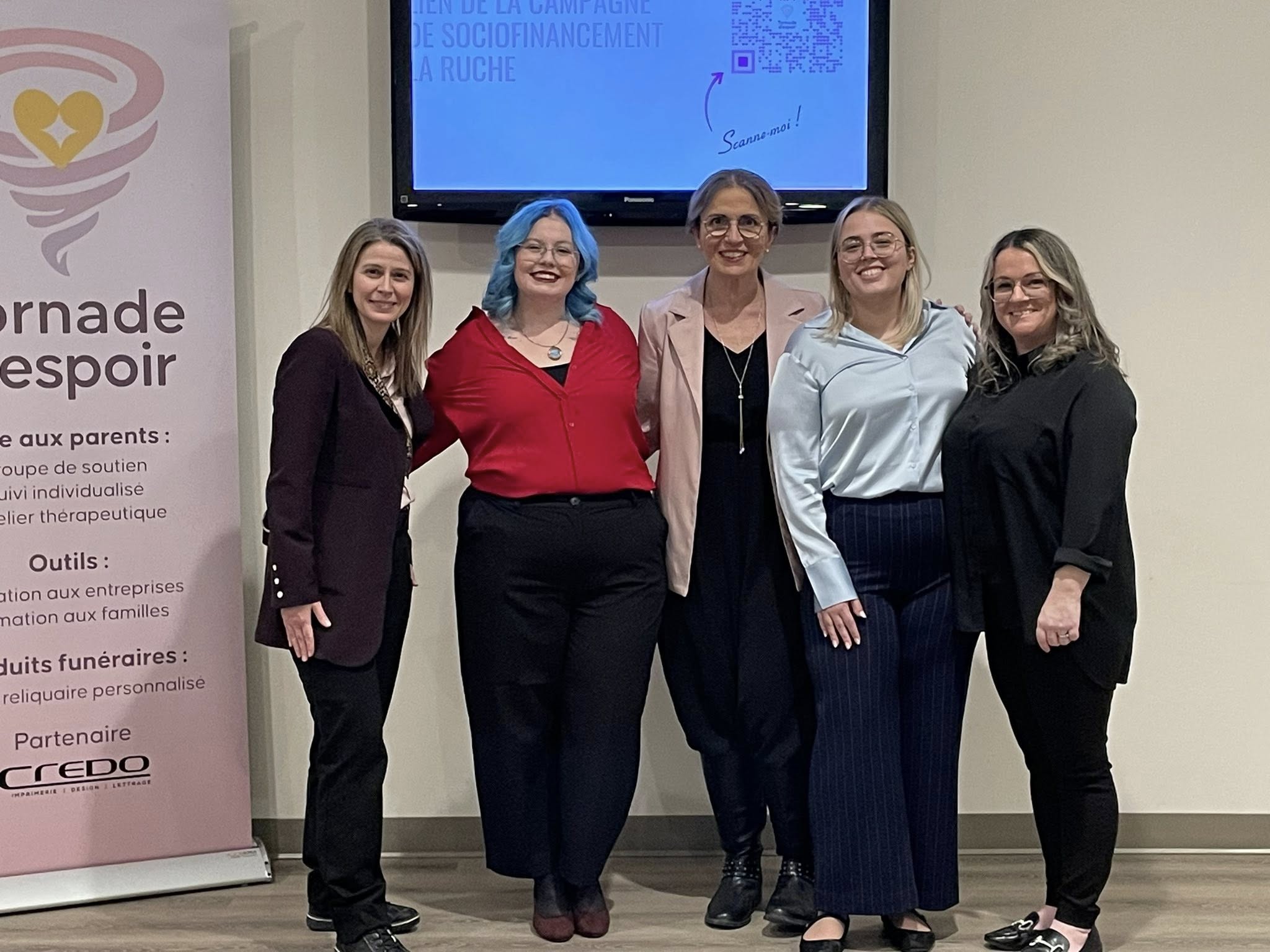 Le 30 janvier dernier, à Lévis, avait lieu le lancement officiel de Tornade d’espoir, un projet créé par et pour des parents vivant un deuil ou un traumatisme lié à la perte de leur enfant, peu importe son âge. Ce nouvel organisme se veut un lieu d’écoute, de soutien et de bienveillance pour accompagner les parents tout en honorant les enfants partis trop tôt. Tornade d’espoir, c’est aussi une communauté qui reste présente aussi longtemps que nécessaire, pour avancer ensemble un jour à la fois. Sur la photo, Joëlle Moreau, Laury Ann Laporte, présidente et directrice générale, Martine Vézina, accompagnatrice au deuil, Carolanne Lagacé Boivert, technicienne en travail social, et Sabrina Chevrette, vice présidente et thanatologue.