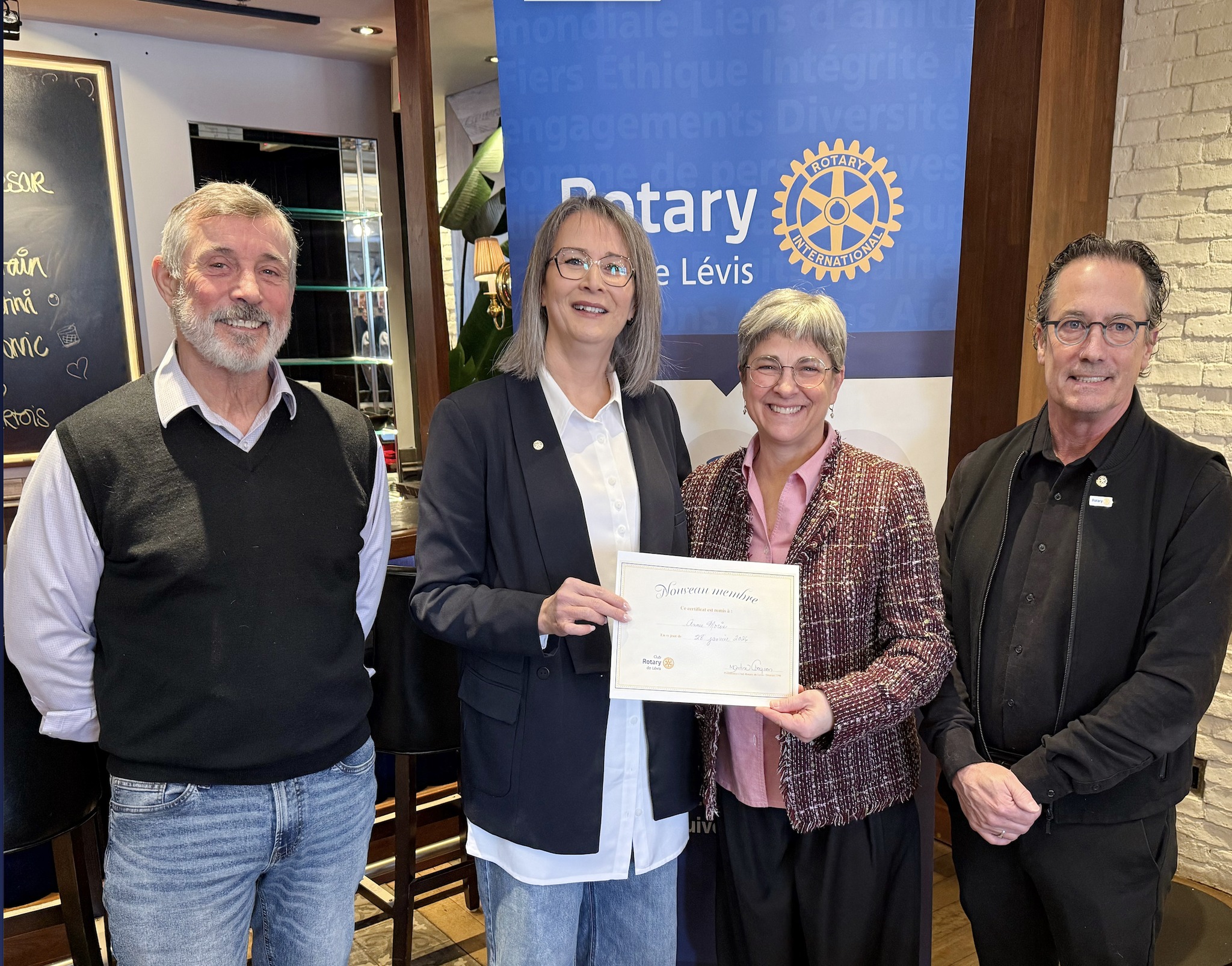 Le Club Rotary de Lévis a accueilli un nouveau membre récemment. Ils ont souhaité la bienvenue à Annie Morin, parrainée par Martin Bellerive, membre fondateur du club. Déjà très impliquée et dynamique au sein de l’organisation, Annie arrive avec une belle énergie et de nombreuses idées à partager. Toutes mes félicitations, chère Annie!
