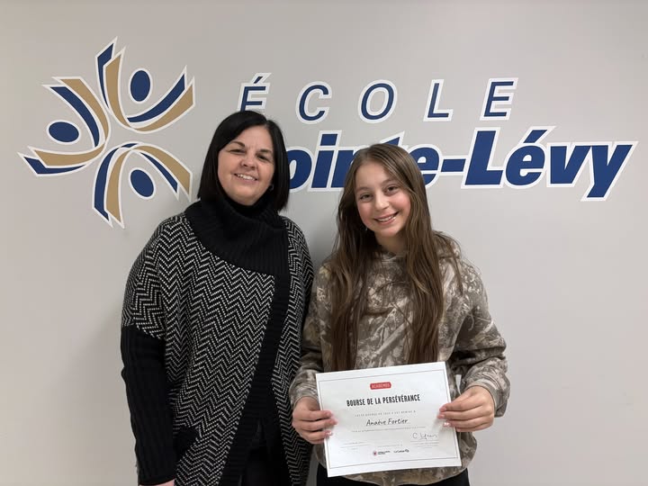 Félicitations à Anaève Fortier, qui reçoit des mains de Karine Morin, directrice adjointe aux PALS, un certificat la désignant comme récipiendaire d’une bourse de 1 000 $ dans le cadre de la Tournée Academos 2025 2026! Une belle reconnaissance pour son engagement et sa persévérance qui méritent d’être soulignés.