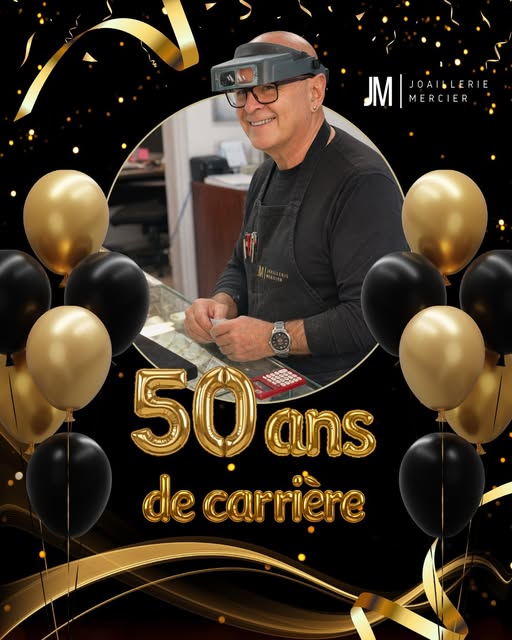 La Bijouterie Joaillerie Mercier souligne un moment remarquable : les 50 ans de carrière de Pierre Mercier comme joaillier. C’est un parcours exceptionnel qui mérite d’être célébré. Félicitations, Pierre, pour cette grande réussite.