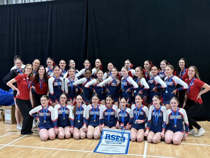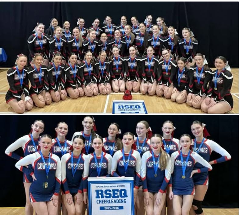Deux équipes de cheerleading des Corsaires ont remporté la médaille d’or lors du Championnat régional du RSEQ QCA. Cette double victoire leur ouvre les portes du Championnat provincial du 18 avril à Trois Rivières. Les athlètes ont impressionné par leur synchronisation, leur énergie et leur rigueur. Une saison remarquable qui se poursuit sur une belle lancée.