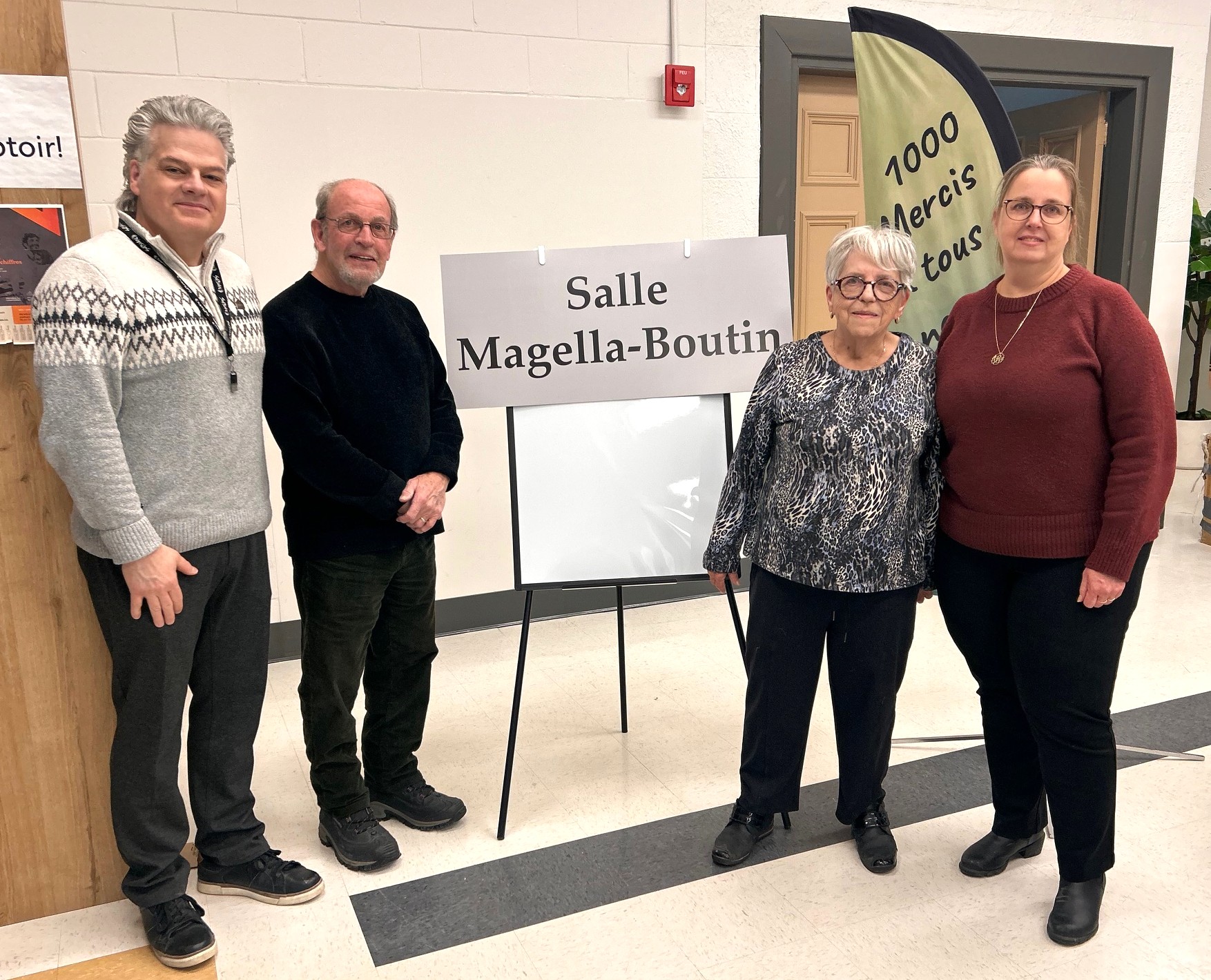 Le Grenier a procédé avec fierté au dévoilement de la salle Magella Boutin, nouvellement nommée en hommage à son fondateur. En 1991, M. Boutin et quelques bénévoles avaient mis sur pied un service de sécurité alimentaire à Lauzon, jetant les bases de l’organisme que l’on connaît aujourd’hui. Lors de la photo officielle, on retrouvait Stéphane Clavet, directeur général, Yvon Gosselin, président du CA, ainsi que Claire et Vicky Boutin, conjointe et fille du fondateur. Cette reconnaissance souligne l’impact durable de M. Boutin dans la communauté. Son nom restera à jamais associé au Grenier.