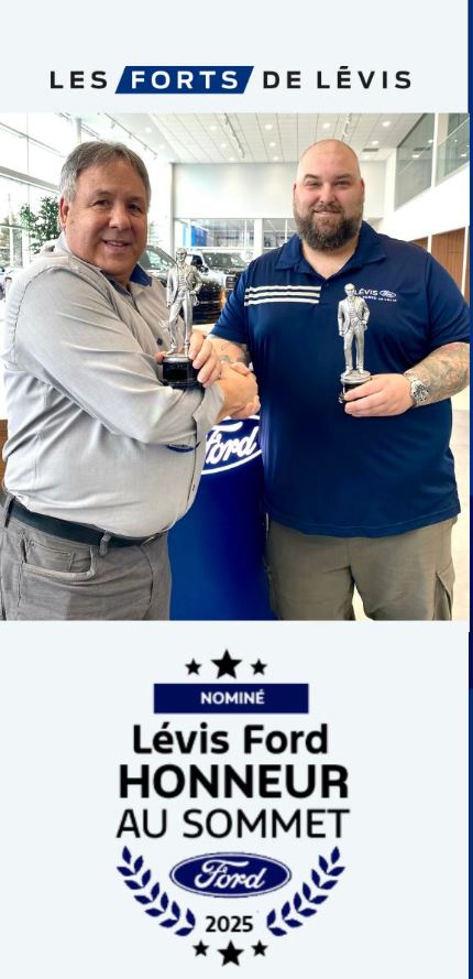 Félicitations à Jean Théberge et Alexandre Cantin, nommés Honneur au Sommet 2025 par Ford Canada! Mention spéciale à Jean, qui reçoit cette distinction pour une 10e année consécutive, preuve de son engagement exceptionnel. Deux membres de l’équipe qui se démarquent par leurs performances en ventes et leur souci constant de la satisfaction client. Merci de faire rayonner Lévis Ford partout au pays.