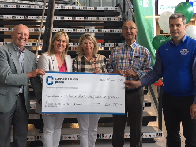 Sur la photo. de gauche à droite : Colin Bilodeau, vice-président du conseil d’administration de la Caisse Desjardins de la Chaudière, Isabel Auger, franchisée propriétaire McDonald’s, vice-présidente du Manoir Ronald McDonald de Québec et coprésidente d’honneur de la journée Plaisir en famille, Janet Jones, conseillère municipale et membre du comité exécutif de la Ville de Lévis , Jacques Auger, franchisé propriétaire McDonald’s, président du Manoir Ronald McDonald de Québec et coprésident d’honneur de la journée Plaisir en famille, ainsi que Louis Simard, directeur général du Complexe 2 Glaces Honco.