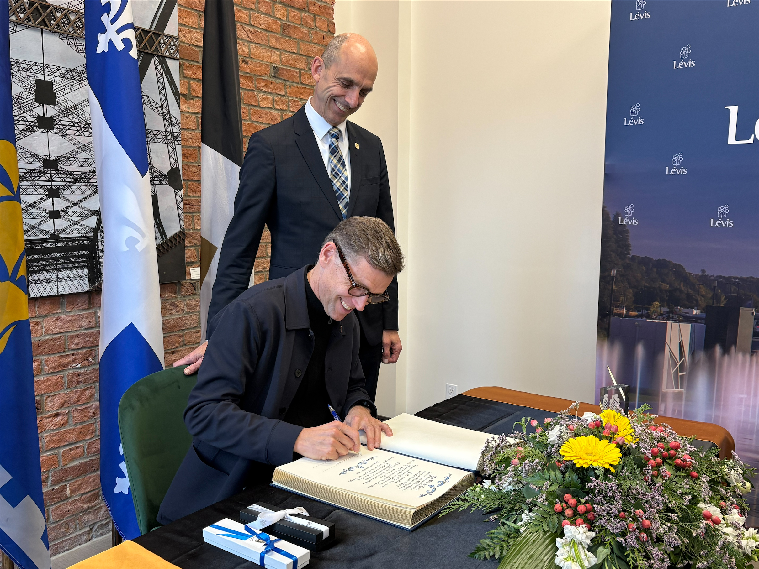 Suite à leur rencontre, Bruno Marchand a signé le Livre d'Or de la Ville de Lévis. -Photo : Xavier Nicole