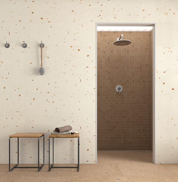 Cette nouvelle couleur chouchou est indéniablement associée aux années 70. Et c’est parfait! La nostalgie a un pouvoir réconfortant, c’est bien connu. Toutefois, en 2026, on choisit ses déclinaisons naturelles : bois, travertin, porcelaine, pierres naturelles.