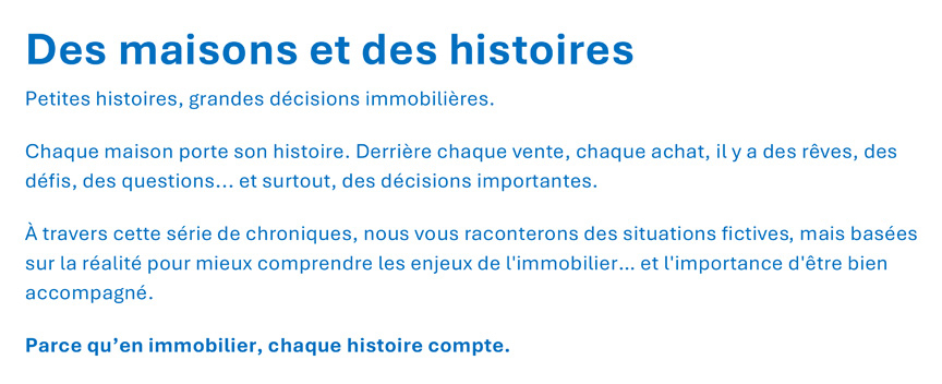 C’est Marielle qui gagne leur confiance. Elle prend le temps d’évaluer sérieusement leur propriété, d’analyser les ventes comparables, les tendances du quartier, et même les conditions du marché dans leur secteur cible. Elle leur propose un prix de vente réaliste et documenté, ni trop haut, ni trop bas. Ils sont d’accord et signent le contrat.