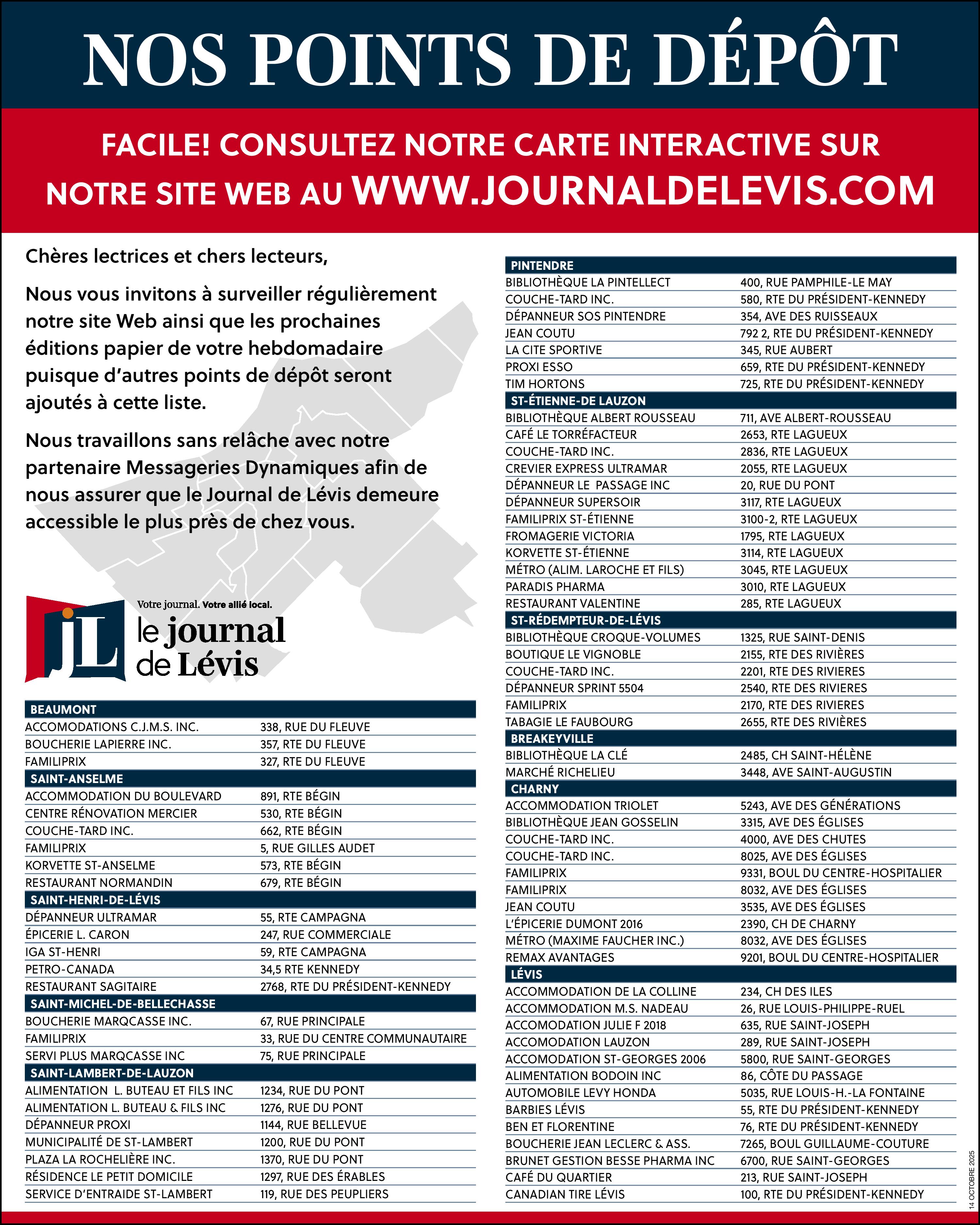 Le Journal de Lévis est disponible chaque semaine dans plus de 200 points de dépôt répartis à travers le Grand Lévis. Si vous n'êtes pas un agriculteur ou un dirigeant d'entreprise, c'est à ces endroits que vous pouvez mettre la main sur une copie de notre édition papier, dès le milieu de la semaine.