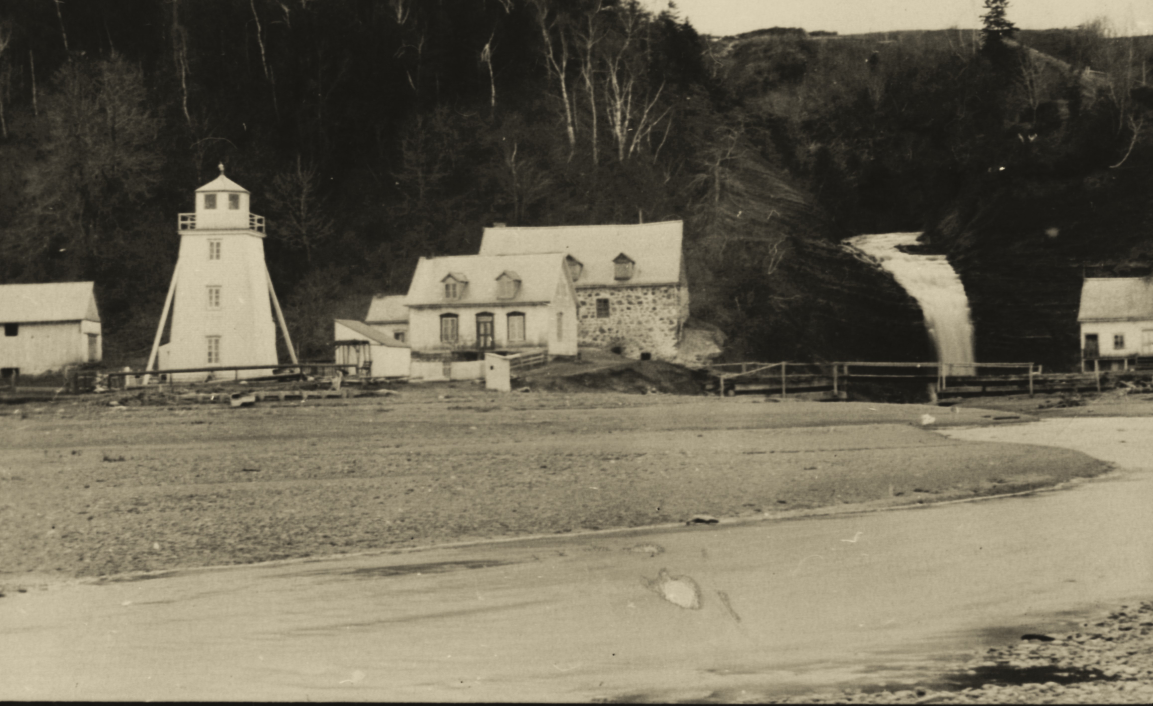 Le moulin banal de la seigneurie de Sainte-Croix fut construit par les Dames Ursulines de Québec en 1754 et il a commencé à moudre le grain le 9 novembre de cette même année. À remarquer le phare et les bâtiments. Photo: Fonds de Patrimoine et histoire des seigneuries de Lotbinière