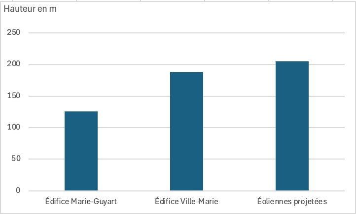 D’une hauteur de 205 m, pales comprises, les éoliennes prévues dépassent l’édifice Ville-Marie de Montréal de 17 mètres.